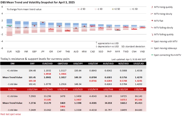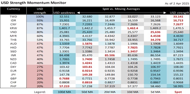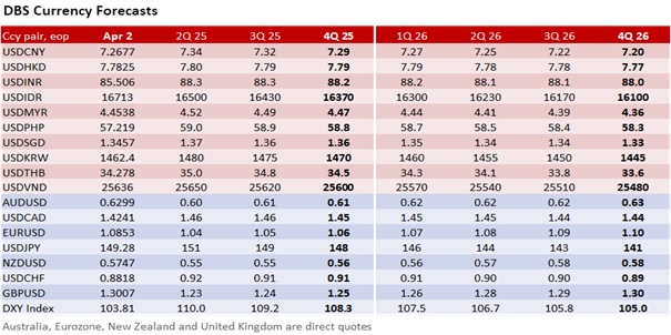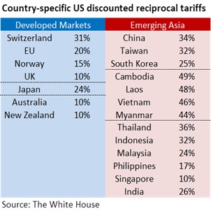 As expected, currencies were pulled in both directions on Trump’s tariff announcement. The cautiously optimistic investor will likely point to the tariff levels as intentionally less aggressive than they could have been. Conversely, the pessimists see Trump’s sweeping tariffs as confirming a hard pivot from decades of globalization towards protectionism. They also view the higher-than-before tariff rates as sufficient to weigh on global trade volumes and world growth, as evidenced by the relatively weaker Asian currencies. Trump’s tariffs on Emerging Asian countries were notably high, sending a message that the US was not just targeting China directly, but also indirectly blocking the “China Plus One” strategy many companies use to diversify supply chains to circumvent US tariffs.