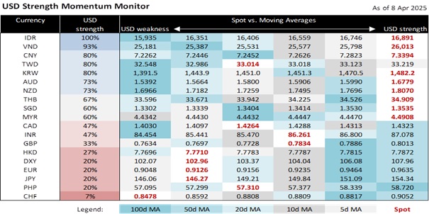 Investors sentiment deteriorated again due to the intensifying trade conflict between the world’s two largest economies, which together account for more than a third of the world economy. US stagflation fears lifted the US Treasury 10Y yield by 10.9 bps to 4.29% and sent the S&P 500 Index below 5000 for the first time since April 2024. Despite the futures market pricing a more than 100% chance for a Fed cut in June, Fed officials viewed tariffs as posing a higher risk to inflation than growth for now. That did not prevent demand worries from extending the decline in WTI crude oil prices below USD60/barrel, four days after they took out 65, a three-year support level. In the currency market, global risk aversion leads investors to reduce exposure to the AUD and NZD, opting instead for traditional havens such as the JPY and CHF. The OIS market priced in more than 60% probability for the Swiss National Bank to lower rates to 0% at its June meeting.