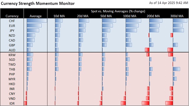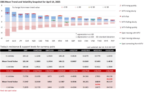 Third, China said it has become meaningless to keep retaliating against Trump’s tariffs; its tariff on US imports from 84% to 125% on April 11 will likely be its last (for now). Fears that China would respond to the high US tariffs with CNY devaluation subsided. Offshore USD/CNH ended last week at 7.2875, below onshore USD/CNY’s 7.2919. In turn, this brought relief to other Asian currencies, especially the VND and IDR. USD/VND retreated from its lifetime high of 26125 to 25737, while USD/IDR peaked at 17224 and fell to 16580. Chinese President Xi Jinping will tour Southeast Asia this week to strengthen regional alliances and economic partnerships amid the challenging global trade landscape.