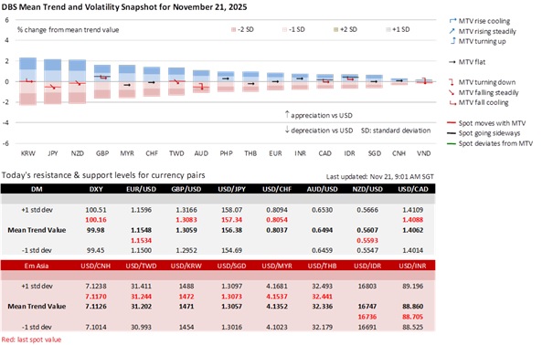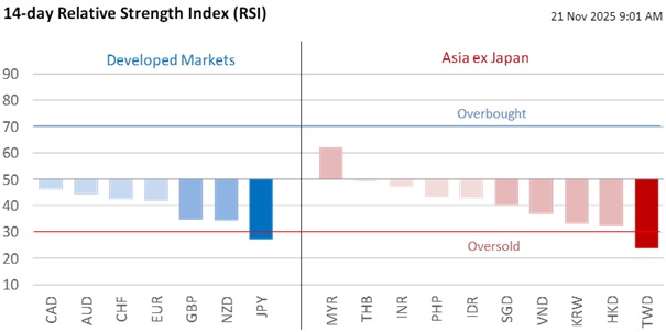 Looking ahead, the greenback faces profit-taking risks ahead of next week’s Thanksgiving holiday-shortened trading week. The S&P 500 and Nasdaq Composite Index fell by 1.6% and 2.2% overnight, unable to shake off persistent AI stock overvaluation worries, amid signs that investors are seeking safety in Treasuries. US President Donald Trump may renew pressure on monetary policy. Apart from wanting to fire Fed Chair Jerome Powell, he joked about removing Treasury Secretary Scott Bessent if interest rates were not lowered quickly enough. The Fed is ending quantitative tightening (QT) on December 1, removing the liquidity scarcity premium that underpinned the USD over the past few years.