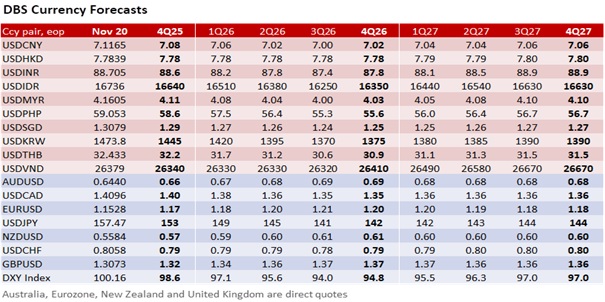 Markets remain on high alert for JPY interventions. USD/JPY is currently above 157.20, above its end-2024 close. Japanese Finance Minister Satsuki Katayama broke her silence this morning, warning that currency interventions would be a possible response to the JPY’s rapid one-sided depreciation. Her comments followed those of government panel member Takuji Aida, who said interventions may come before the JPY depreciates to 160 per USD. The weak JPY accounted for most of the DXY’s appreciation this month – JPY (-2.2%), GBP (-0.6%), CAD (-0.6%), CHF (-0.2%), and EUR (-0.1%). Meanwhile, Bank of Japan Governor Kazuo Ueda is scheduled to appear before parliament this morning. National CPI ex fresh food rose to 3% YoY in October from 2.9% in September. Prime Minister Sanae Takaichi is preparing an economic package to address the cost of living, which led voters to strip the LDP-led coalition of its majority in both houses. Japan’s policymakers have explicitly recognised the link between the JPY’s weakness and inflation, not helped by negative real interest rates.
