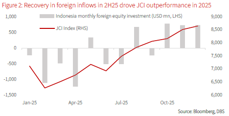 Indonesia – Following a notable correction early 2025, Indonesia equities demonstrated a vigorous rebound with JCI achieving new all-time highs throughout 2H25. Their resilient performance – despite IDR weakness – signals renewed investor confidence; driven by firmer domestic fundamentals and reduced political uncertainty. Foreign investors’ positioning also shifted meaningfully, reversing from sizable outflows in 1H25 to strong inflows in 2H25.