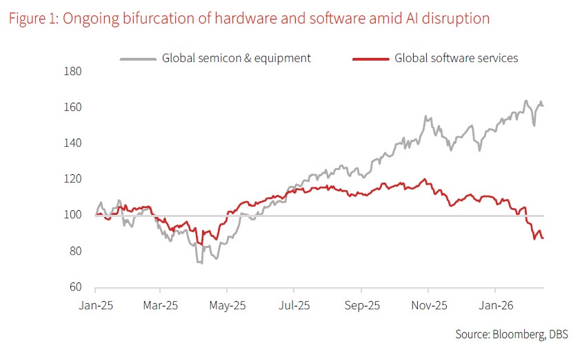 Not an apocalypse. While Agentic AI disruption is a reality confronting the software industry (a trend we highlighted in “Global Technology: Segments Facing Disruption in the Age of AI”, published on 19 Aug 2025”), we believe the severity of the latest sell-off is overdone and reflects an overextension of logic. Markets are pricing a wholesale disruption of traditional SaaS models, but such a scenario is extreme at best. There is an unjustified extrapolation of selective pressure within parts of the enterprise software space (in this case legal technology) into a broad structural impairment of the technology software sector. In reality, AI disruption will likely happen in a much more selective and nuanced manner. We explain below how we think AI disruption will take place in both software and hardware, and our preferences within each of those spaces.