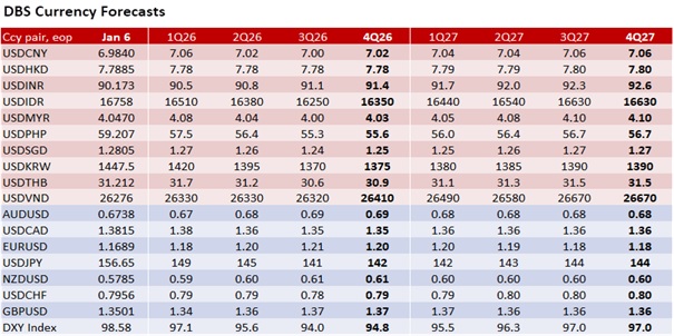 We remain mindful of the tight relationship between USD/SGD and the DXY Index, reflecting Singapore’s status as a price-taker economy. Our view remains that USD/SGD will trade in a 1.25-1.30 range in 2026, consistent with our forecast for the DXY to trade in a 95-100 range. The USD’s downside risks for 2026 remain intact, as markets brace for a potentially more dovish Fed Chair nominee under Trump, reigniting concerns over Fed independence.