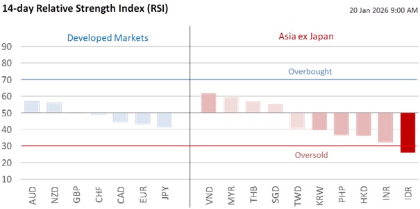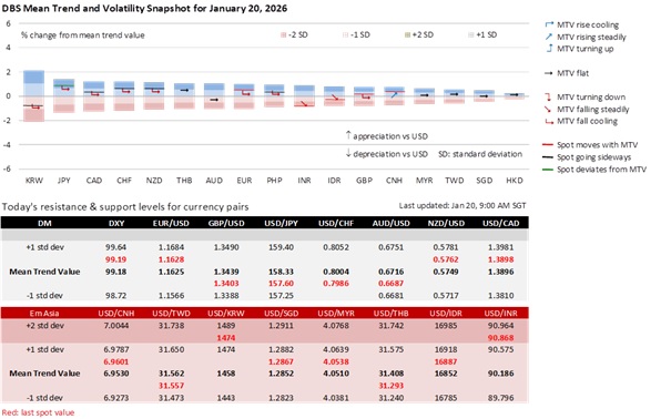The DXY Index depreciated by 0.4% to 99 overnight following a three-week rally. The greenback depreciated despite US President Donald Trump’s renewed tariff threats on the EU over Greenland, as focus remains on the risk of an adverse Supreme Court ruling against the tariffs imposed under the International Emergency Economic Powers Act (IEEPA). Markets interpreted the rise in the US Treasury 10Y yield above 4.20% as an unfavourable ruling, opening the prospect of duty refunds that would widen the fiscal deficit, blunting the USD’s tariff-haven status. Meanwhile, Fed Chair Jerome Powell’s presence at the Court’s hearing of Governor Lisa Cook also sharpened the market’s focus on the institutional risks posed by Trump’s policies.