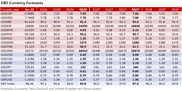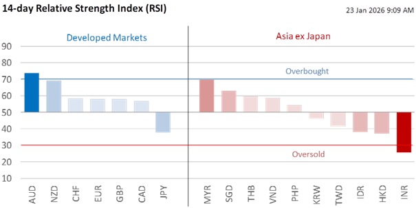 Yesterday’s 0.4% decline in the DXY Index reflected an unwinding of the geopolitical risk premium about escalation risks around Greenland. Attention will likely shift back to the Fed, where guidance points to a January hold with policy closer to neutral. Greater clarity on Fed leadership succession has reduced near-term risk about its independence. Against this backdrop, we are cautious about the market’s bet that the appreciation momentum of the AUD and CNY will continue unbated.