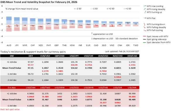 Focus falls on President Trump’s State of the Union Address (SOTU) on February 24 at 9:00 pm ET or February 25 at 10:00 am SGT. Trump warned that the speech would be long amid a partial government shutdown and boycotts by several House Democrats. Markets expect SOTU to become his rallying cry for the 2026 midterm elections amid sagging approval ratings. Trump is expected to address affordability issues with populist measures such as capping credit card interest rates at 10%, lowering prescription drug prices, and restricting corporate dominance of the housing market. To resell his “America First” economic vision to the public, Trump will expect Kevin Warsh to follow his roadmap toward much lower interest rates and a smaller Fed balance sheet to boost US growth to 15%.