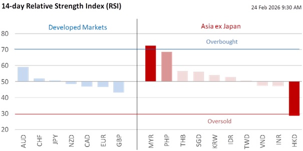 While the DXY Index was barely changed at 97.72, JPY and CHF rose by 0.26% and 0.12% respectively as havens. CAD depreciated most in the DXY market by 0.12% after Canadian officials warned that the Section 122 tariffs could leave the country worse off than before. The EU suspended the ratification of a trade deal struck in late 2025 and is seeking clarity on how the ruling impacts previous agreements. India also deferred previously scheduled talks to finalise a trade agreement due to the new legal uncertainties. EUR/USD was unchanged at 1.1785 while INR rose marginally by 0.1% to 90.88.