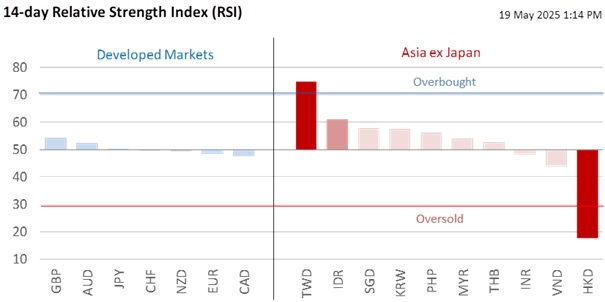 Second, the Melbourne Institute’s inflation gauge may be front-running CPI inflation, coming in surprisingly firmer at 3.3% YoY in April vs. 2.8% in March, above the RBA’s target of 2-3%. The wage price index increased to 3.4% YoY in 1Q25 from 3.2% in 4Q24, but mainly in the public sector instead of the private sector.