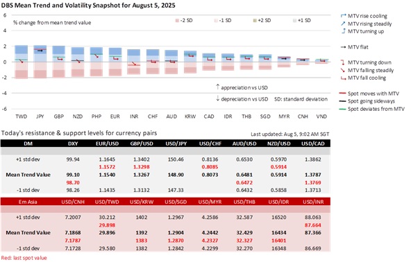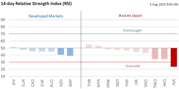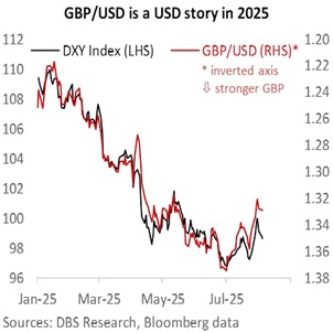 GBP/USD has been more about the US rather than the UK in 2025. GBP’s rise from the year’s low of 1.21 in mid-January to its 1.38 high on July 1 was driven by the DXY Index’s worst first-half decline since 1973. Similarly, GBP’s decline to 1.3140 was aligned with the DXY’s broad global recovery in July. That trajectory was upended by last Friday’s significantly weaker US nonfarm payrolls, which revived worries about US growth and reinstated the market’s bet that the Fed would resume cuts in September, followed by easings in the remaining two meetings in 4Q25. Hence, the Fed’s guidance at the Jackson Hole Symposium on August 21-23 will be of critical importance. Following its rebound to 1.33 on August 1, GBP/USD could consolidate first in the 1.3150-1.3450 range seen in April-May.