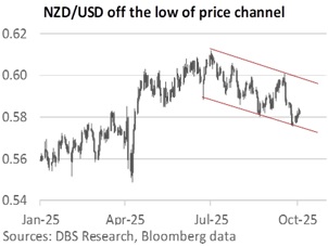 The Reserve Bank of New Zealand’s (RBNZ) meeting on October 8 could offer a tactical opportunity to turn constructive on the NZD. The OIS market appears over-priced for easing, with the official cash rate (OCR) to decline by a total 75 bps 2.25% this year, split between a 50-bps cut on October 8 and a 25-bps reduction on November 26. Acting Governor Christian Hawkesby has limited his projection for the OCR to 2.50%, the floor of the neutral rate range of 2.5-3.5%. Incoming Governor Anna Breman, who assumes office on December 1, has pledged a laser focus on low and stable inflation. With CPI inflation rising to 2.7% YoY in 2Q25 from 2.2% in 4Q24, within the upper half of the RBNZ’s 1-3% inflation target range. NZD/USD could extend its recovery towards 0.5960 if it breaks above its resistance at 0.5850.