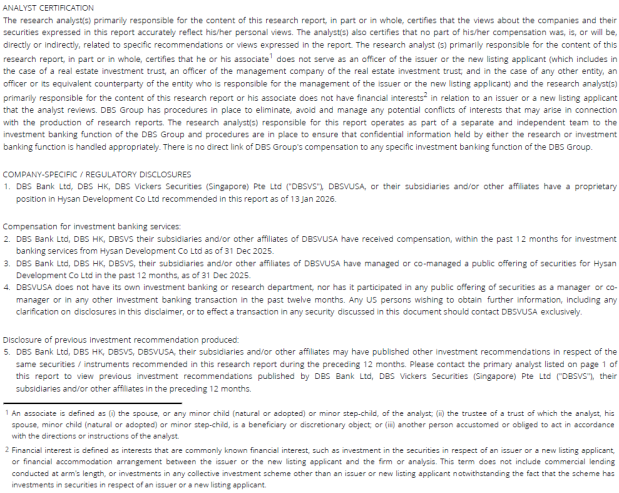This report is prepared by DBS Bank (Hong Kong) Limited (“DBS HK”). This report is solely intended for the clients of DBS Bank Ltd., DBS HK, DBS Vickers (Hong Kong) Limited (“DBSV HK”), and DBS Vickers Securities (Singapore) Pte Ltd. (“DBSVS”), its respective connected and associated corporations and affiliates only and no part of this document may be (i) copied, photocopied or duplicated in any form or by any means or (ii) redistributed without the prior written consent of DBS HK.
