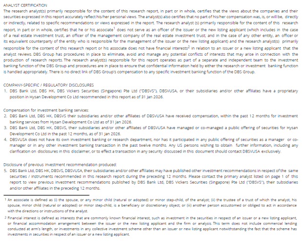 This report is prepared by DBS Bank (Hong Kong) Limited (“DBS HK”). This report is solely intended for the clients of DBS Bank Ltd., DBS HK, DBS Vickers (Hong Kong) Limited (“DBSV HK”), and DBS Vickers Securities (Singapore) Pte Ltd. (“DBSVS”), its respective connected and associated corporations and affiliates only and no part of this document may be (i) copied, photocopied or duplicated in any form or by any means or (ii) redistributed without the prior written consent of DBS HK.