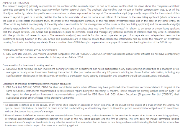 Any valuations, opinions, estimates, forecasts, ratings or risk assessments herein constitutes a judgment as of the date of this report, and there can be no assurance that future results or events will be consistent with any such valuations, opinions, estimates, forecasts, ratings or risk assessments. The information in this document is subject to change without notice, its accuracy is not guaranteed, it may be incomplete or condensed, it may not contain all material information concerning the company (or companies) referred to in this report and the DBS Group is under no obligation to update the information in this report.