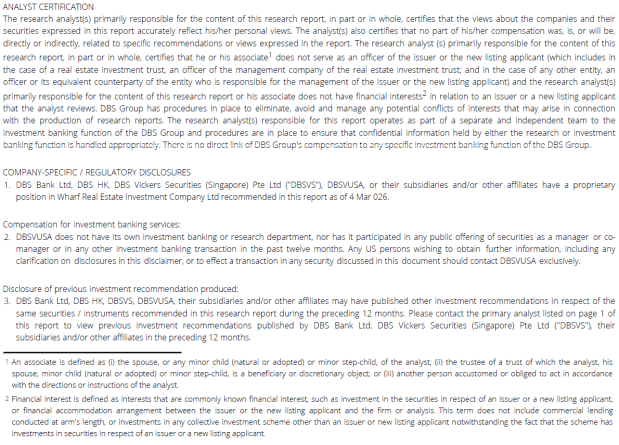 Hong Kong | This report is being distributed in Hong Kong by DBS Bank Ltd, DBS Bank (Hong Kong) Limited and DBS Vickers (Hong Kong) Limited, all of which are registered with or licensed by the Hong Kong Securities and Futures Commission to carry out the regulated activity of advising on securities. DBS Bank Ltd., Hong Kong Branch is a limited liability company incorporated in Singapore. For any query regarding the materials herein, please contact Dennis Lam (Reg No. AH8290) at [email protected] |