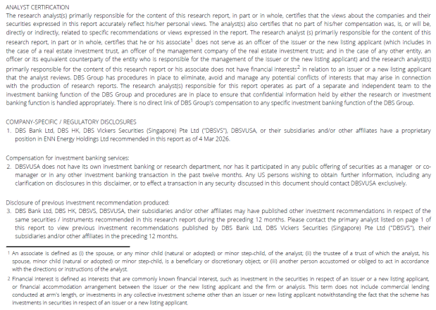 Looking into FY26, gas distribution business faces challenges from shortage of LNG globally with elevated LNG prices. With a flexible and resilient resource pool to ensure cost competitiveness, including annual contracts and long-term agreements with major oil companies and long term LNG contracts, ENN will accelerate the development of new large customers to maintain its "volume-driven" strategy to ensure scale growth, even with fluctuating gas prices. Hence, we estimate c.2% sales volume growth will be achieved at the expense of lower dollar margin in FY26, which we have conservatively cut by RMB0.015/cm.