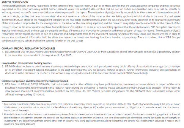 Singapore | This report is distributed in Singapore by DBS Bank Ltd (Company Regn. No. 196800306E) or DBSVS (Company Regn No. 198600294G), both of which are Exempt Financial Advisers as defined in the Financial Advisers Act and regulated by the Monetary Authority of Singapore. DBS Bank Ltd and/or DBSVS, may distribute reports produced by its respective foreign entities, affiliates or other foreign research houses pursuant to an arrangement under Regulation 32C of the Financial Advisers Regulations. Where the report is distributed in Singapore to a person who is not an Accredited Investor, Expert Investor or an Institutional Investor, DBS Bank Ltd accepts legal responsibility for the contents of the report to such persons only to the extent required by law. Singapore recipients should contact DBS Bank Ltd at 6878 8888 for matters arising from, or in connection with the report. |
