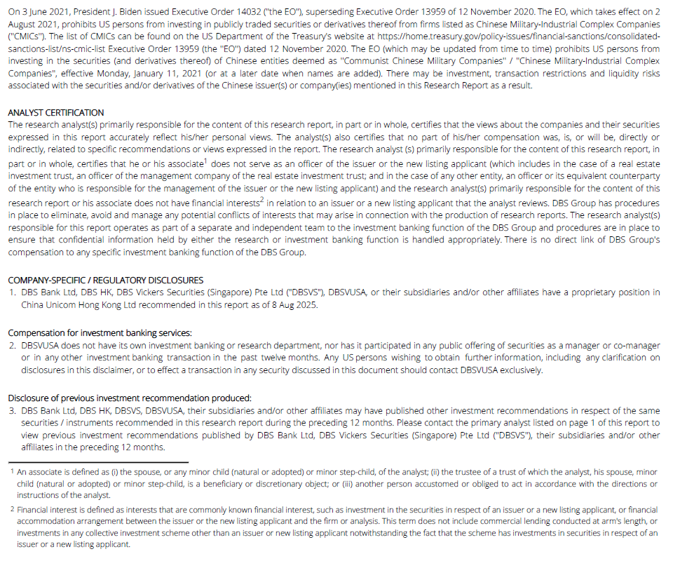 United States | This report was prepared by DBS HK. DBSVUSA did not participate in its preparation. The research analyst(s) named on this report are not registered as research analysts with FINRA and are not associated persons of DBSVUSA. The research analyst(s) are not subject to FINRA Rule 2241 restrictions on analyst compensation, communications with a subject company, public appearances and trading securities held by a research analyst. This report is being distributed in the United States by DBSVUSA, which accepts responsibility for its contents. This report may only be distributed to Major U.S. Institutional Investors (as defined in SEC Rule 15a-6) and to such other institutional investors and qualified persons as DBSVUSA may authorize. Any U.S. person receiving this report who wishes to effect transactions in any securities referred to herein should contact DBSVUSA directly and not its affiliate. |