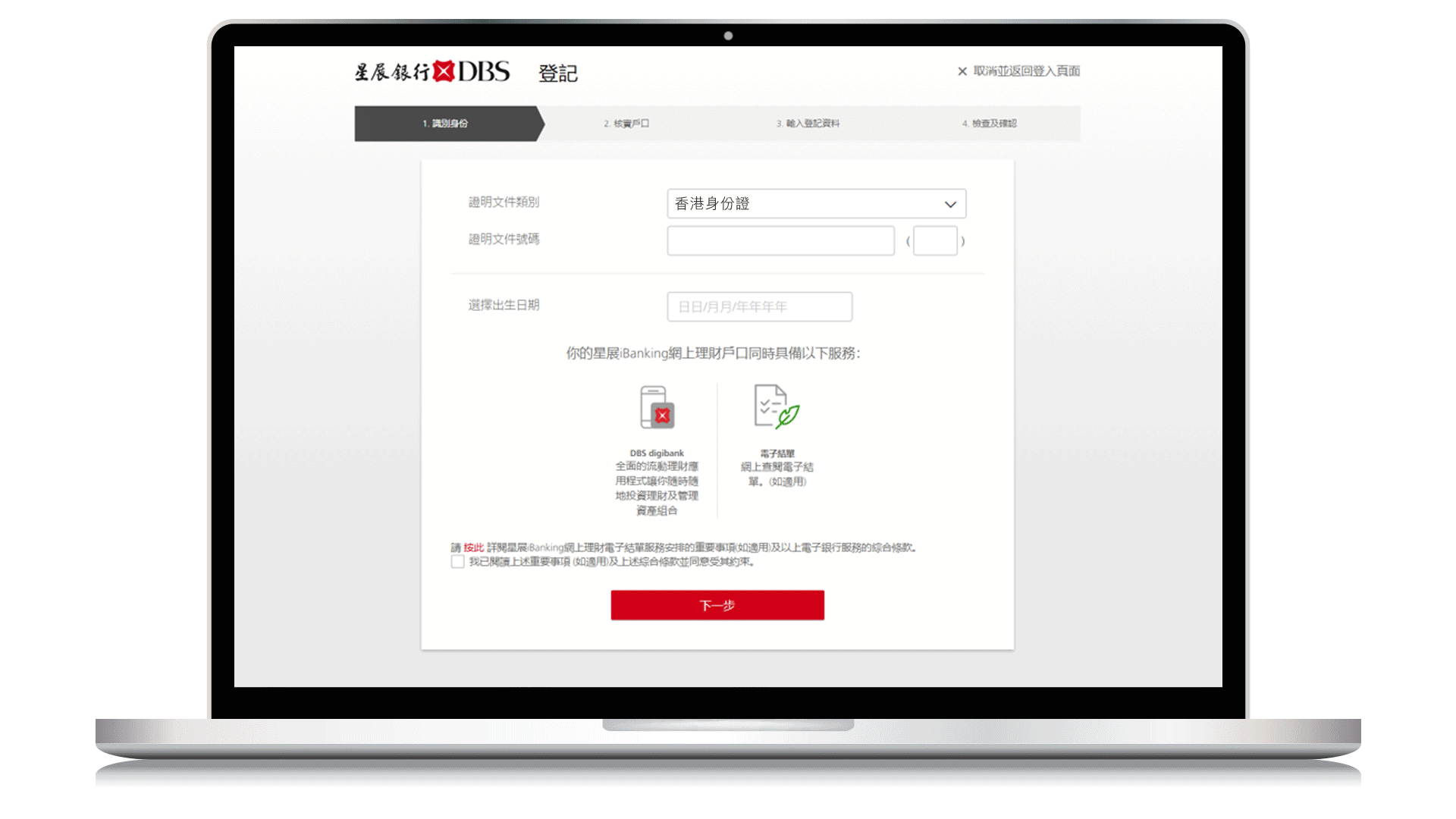 - Step 1: 提供個人身份證明資料以開始登記。您可選擇使用香港身份證或護照/往來港澳通行證以進行身份識別。